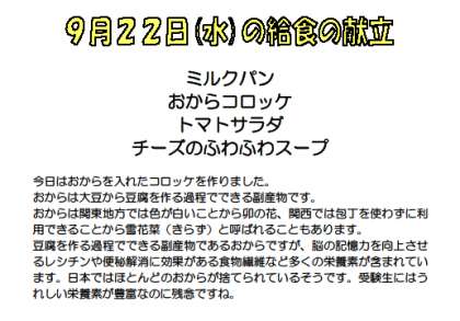 9月22日 本日の献立と産地
