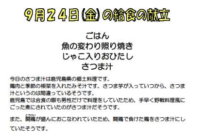 9月24日 本日の献立と産地