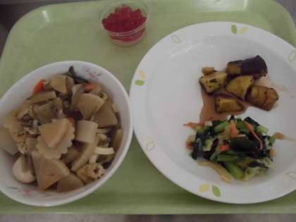 今日はリクエスト給食のアンケートで多かったうどん、大学芋、あじさいゼリーです。