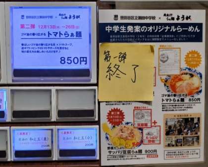 「中学生発案のオリジナルラーメン」第2弾「ゴマ油の香り広がる トマトらぁ麺」が用賀駅近くにある店舗(貝出汁らぁ麺 ようが)で、発売されました。