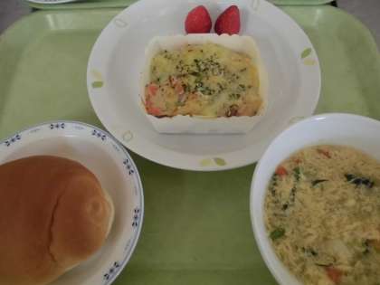 今日はリクエスト給食のアンケートで多かったマカロニグラタンといちごです。
