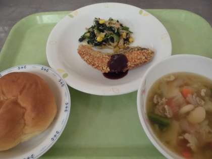 今日はリクエスト給食のアンケートで多かったサーモンフライです。