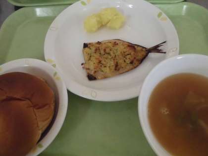 今日のいわしは白ワイン・レモン汁・マヨネーズのソースをのせパン粉を散らして焼きました。少し食べにくいかもしれませんが、フォークを上手に使って食べてみてください。
