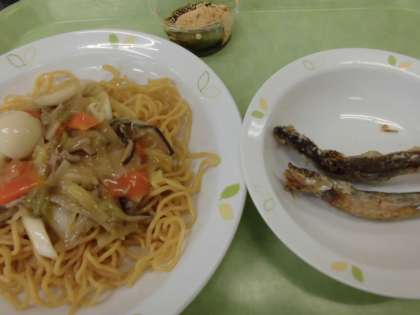 具だくさんでいろいろな栄養が取れるあんかけ焼きそばにカルシウムたっぷりのししゃもの唐揚げと食欲不振や消化不良を改善してくれる鉄分を多く含むヨモギを使ったお団子を作りました。