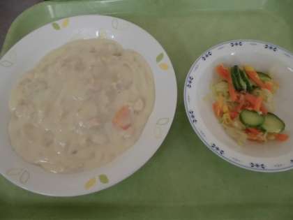 給食ではターメリックライスにホワイトソースをかけて食べます。