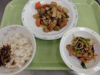 給食では筑前煮とがめ煮では少しずつ材料が違います。違いを見つけてみるのもおもしろいですよ。