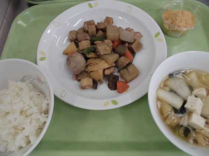 給食では里芋を使った煮物と丸い形のだんごにきな粉をまぶして月見だんごを作りました。