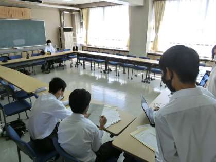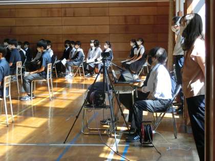 立会演説会は、格技室で行い2年生が代表で現場に立会い、1・3年生は教室でオンラインで参加しました。