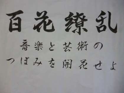 「私からは今年の学芸発表会のスローガンを発表させていただきます。今年のスローガンは、「百花繚乱〜音楽と芸術のつぼみを開花せよ〜」です。このスローガンは3年B組の方に書いてもらいました。百花繚乱には、様々な花が華やかに咲き乱れている、という意味があります。この意味のように、各クラスや学年、一人一人の色とりどりな個性が音楽と芸術で溢れたような学芸発表会にしたいと思い、決定しました。今年の学芸発表会は、このスローガンをもとに、皆さんの心に残るような行事をつくっていきましょう。」