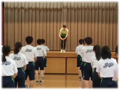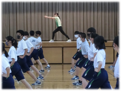 今年度は、全学年、ラジオ体操教室を実施しました。講師の先生に御指導いただき、「簡単な動きでも、揃っていたり、大勢で行ったりすると、素敵な演技に見える」と感じました。