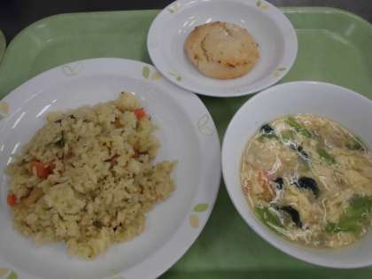 学校ではカレー粉をサフランの代用として使用し、具材とご飯を混ぜて作りました。