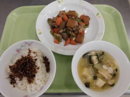 給食では筑前煮とがめ煮では少しずつ材料が違います。違いを見つけてみるのもおもしろいですよ。