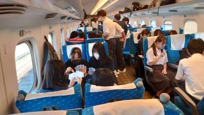 新幹線の車内で、自由時間です。トランプなどそれぞれの時間を過ごしています。