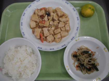 家常(じゃーじゃん)豆腐(どうふ)は中国四川省の家庭料理です。四川省の料理は辛い料理が多いですが、家常豆腐は辛くありません。家常豆腐は漢字の通り“家で日常的に作る豆腐料理”という意味です。家常豆腐に使われる豆腐は豆腐を揚げた生揚げを使います。給食では豆腐で作りました。