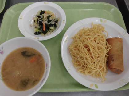 給食ではどんぶりがないため、しっかり食べてもらおうと麺と スープを別々にしたつけ麺風にしました。寒くなってきました。しっかり食べて強い体を作りましょう。