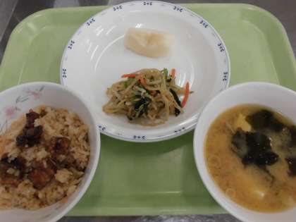片栗粉をまぶして揚げ、甘辛いタレをかけてごはんに混ぜています。