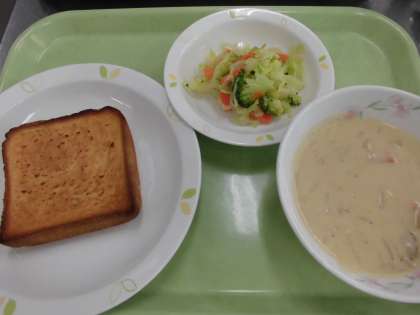 今日の給食のような白いクリームスープ仕立てなのが、ニューイングランド風で、ほかにトマトを加えた赤いスープのマンハッタン風、魚介の澄んだスープで作られるロードアイランド風があります。