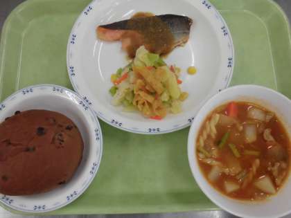 給食ではトマトなどいろいろな野菜とマカロニを入れたミネストローネを作りました。