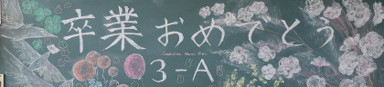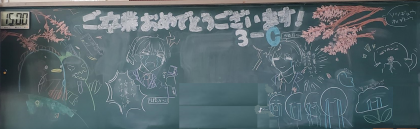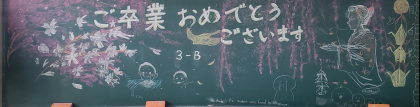 卒業式や歓送式が無事に実施できるように、1・2年生は、何日も前から事前準備をしていました。会場準備は2年生が、装飾は美術部の皆さんが、3年生の教室の黒板アートは、2年生が作成しました。吹奏楽部の皆さんは、冬休みから練習に取り組んでいたそうです。全校合唱「旅立ちの日に」は、2学期末から取り組んでいたそうです。