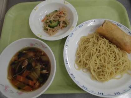 今日はリクエスト給食のアンケートで多かったしょうゆラーメンと春巻きです。醤油ラーメンはしっかり食べてほしいので、つけ麺風にしました。