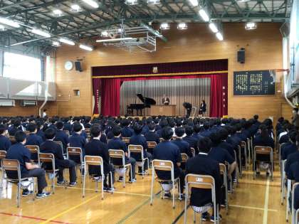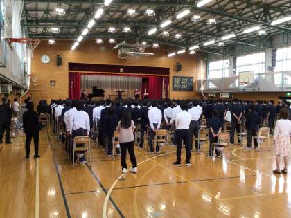4月26日(金)の6時間目に離任式が行われました。今回は4名の先生が離任されましたが、2名の先生がご出席くださいました。お忙しい中、ありがとうございました。先生方のお話に続き、生徒代表から贈る言葉と花束の贈呈がありました。最後は全生徒・教職員による大きな歌声の校歌斉唱となりました。