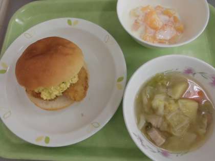 フルーツヨーグルトとともに癒しの給食をおいしく食べましょう。