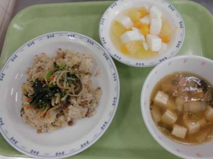 ビビンバのビビンは“混ぜる”、バは“ごはん”という意味で、ごはんの上にのった肉や野菜をごはんと混ぜて食べる料理です。