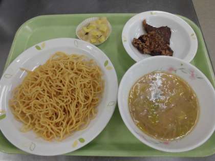 今日はリクエスト給食のアンケートで多かったラーメンとくじらの竜田揚げです。