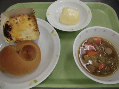 「シスコンマッカラケイト」はソーセージのスープです。本場ではフランクフルトサイズのソーセージを使うそうですが、給食ではウインナーサイズのソーセージを使いました。