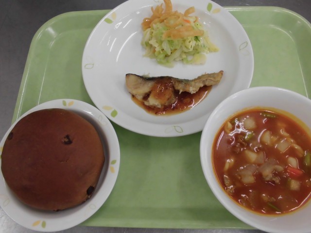 給食ではトマトなどいろいろな野菜とマカロニを入れたミネストローネを作りました。