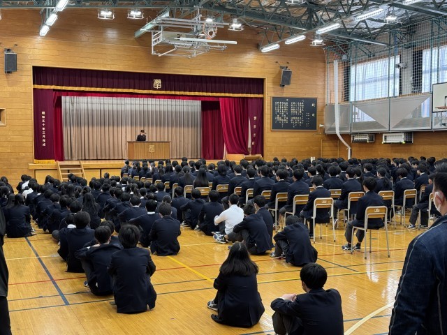今年度最後の生徒会朝礼を行いました。この後、1・2年生は卒業式の練習を行います。