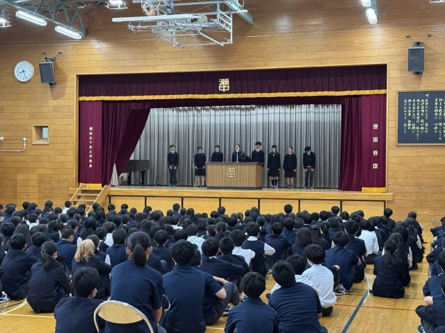 今年度初めての、生徒会朝礼を行いました。生徒会役員が司会を務め、各委員会からの報告・連絡をします。今回は初回なので、全ての委員長が登壇して、委員会の方針等を説明していました。