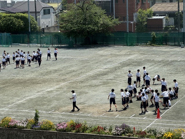 1年生は体育の授業で、全員リレーをしました。