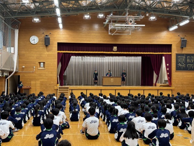 生徒会朝礼では、学級委員長から授業の様子、保健給食委員長から配膳中のお願いについて、話がありました。また、生徒会役員から、運動会の生徒会種目について連絡がありました。