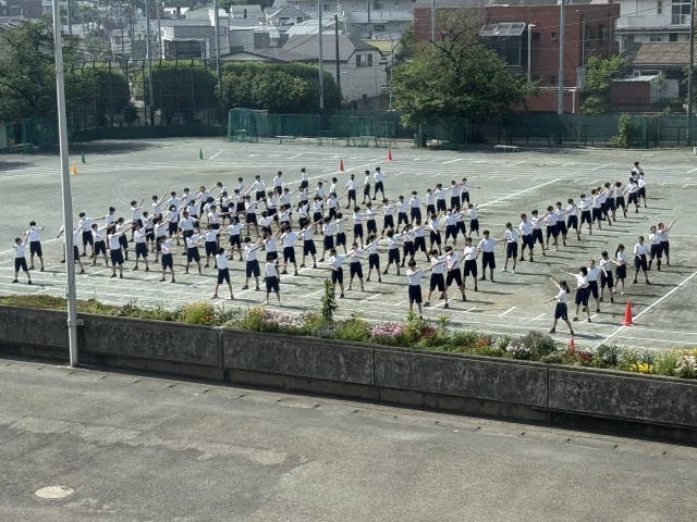 午前中に、2年学年練習、1年学年練習をしました。午後に、第2回全体練習を行いました。3つの学年がそろうと、迫力があります。運動会当日が楽しみです。