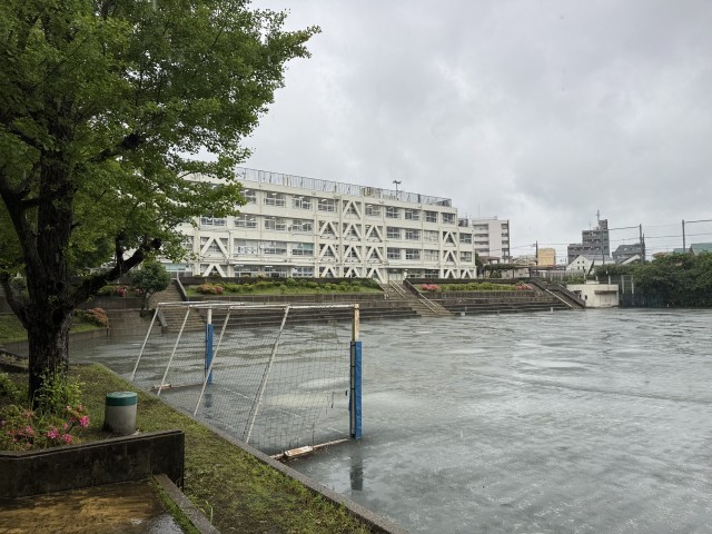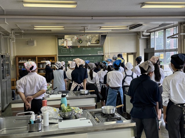 写真は、雨の日の校舎と1年生の調理実習の授業の様子です。