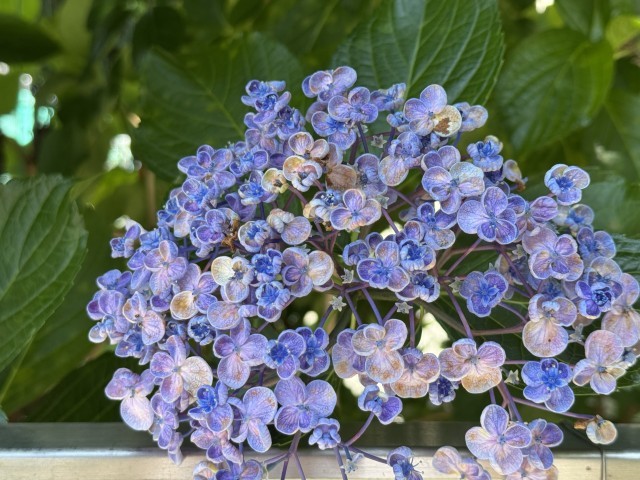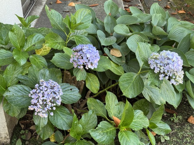 校舎入り口や校庭に、アジサイの花が咲いています。