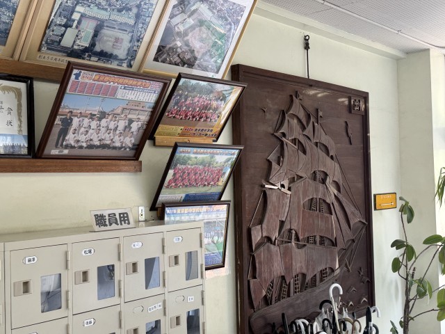 校舎入り口には、卒業生の「出帆」をイメージした作品や同窓会から寄贈されたショーウインドーがあります。