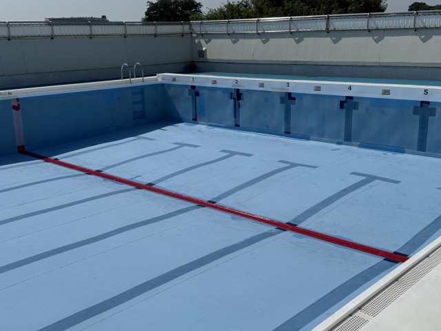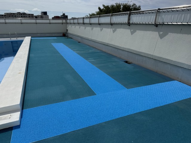 瀬田中学校のプールは、格技棟の屋上にあります。事前にプール内の塗装やプールサイドの修理を行いました。
