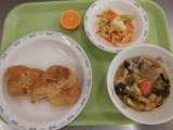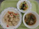 【本日の献立】 豆腐のうま煮丼 白菜と春雨のスープ きゃべつとわかめのナムル ...