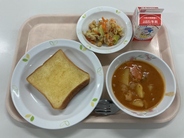 メープルバタートースト トマトチキンシチュー ひよこ豆のサラダ 牛乳