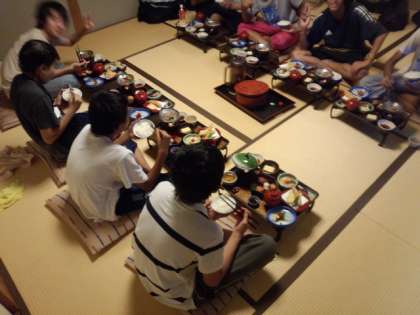 1日目の行動がなんとか無事に終了し、夕食の時間です。明日に備えてたくさんいただきましょう。いただきま〜す。