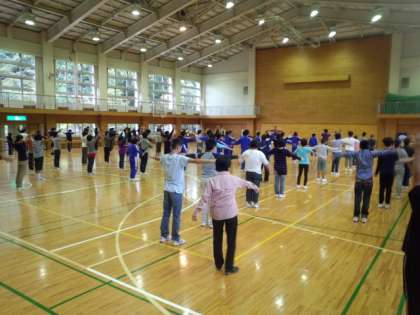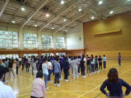 2日目の朝礼です。ゆうべはみんなよく眠れたようです。今日も1日頑張りましょう!