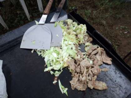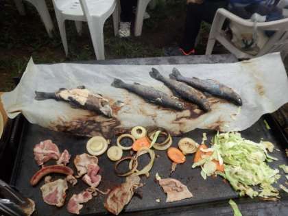 お昼ご飯はバーベキュー、鱒付き。美味しいね〜。