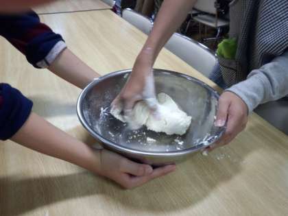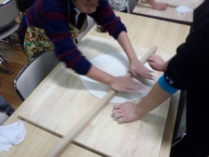 夕飯のためのうどんづくりをしています。みんな真剣です。