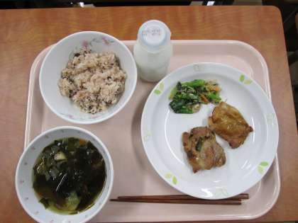本日の献立は、「赤飯・すまし汁・鶏肉の香味焼き・野菜のごまみそかけ」でした。