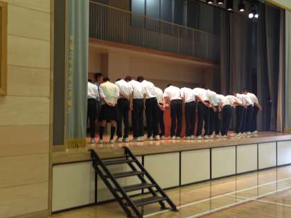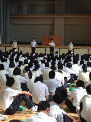 7月14日は生徒会朝礼でした。各学年委員長と図書委員長から全校生徒に連絡報告がありました。その後部活動の表彰で野球部が表彰されました。先週の全校朝礼では、剣道部と女子バレーボール部が夏季大会の表彰を受けました。どの部活動も夏季大会よく頑張りました。