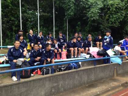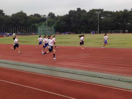 あいにくの雨模様の中ですが、区陸上競技大会が予定どおり行われています。最初の競技1年生女子100m予選で1位でゴールしました。