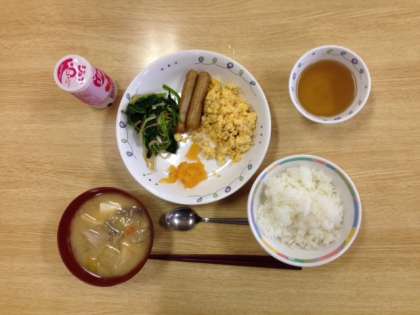 移動教室二日目が始まりました。朝礼の後、朝食を食べました。朝食のメニューは、ごはん、豚汁、ウインナー、炒り卵、ほうれん草のおひたし、漬物、ジョアです。今日の富士河口湖町の天気予報は曇り時々晴れです。