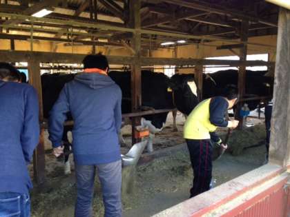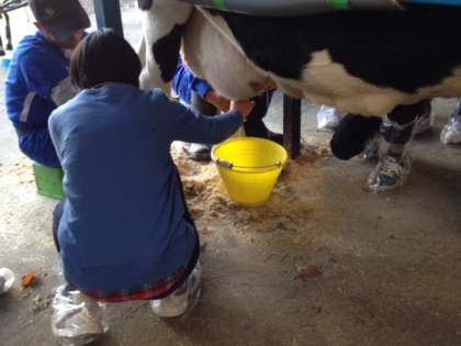酪農体験では、まず乳牛のちち搾り、乳牛の餌やりやブラッシングを体験しました。
